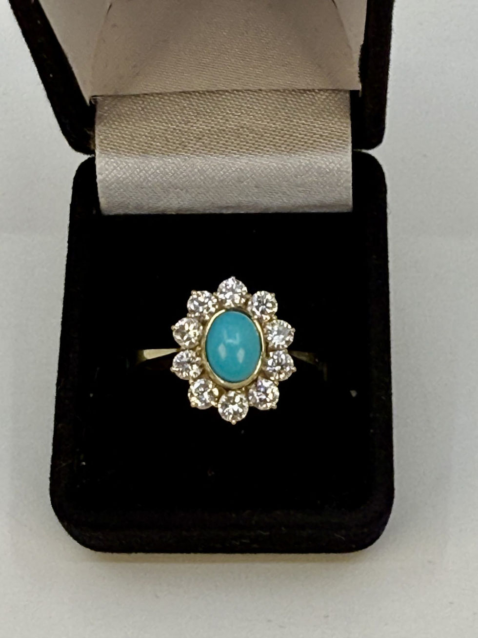 Zlatý prsten typu markýz s tyrkysem a brilianty 1.30 ct