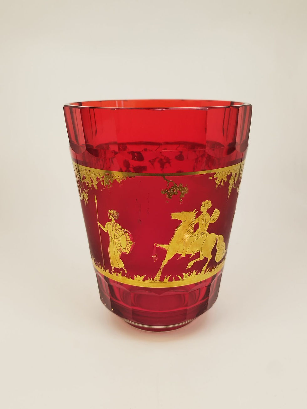 Starožitná rubínová váza s mytologickým motivem, ART DECO