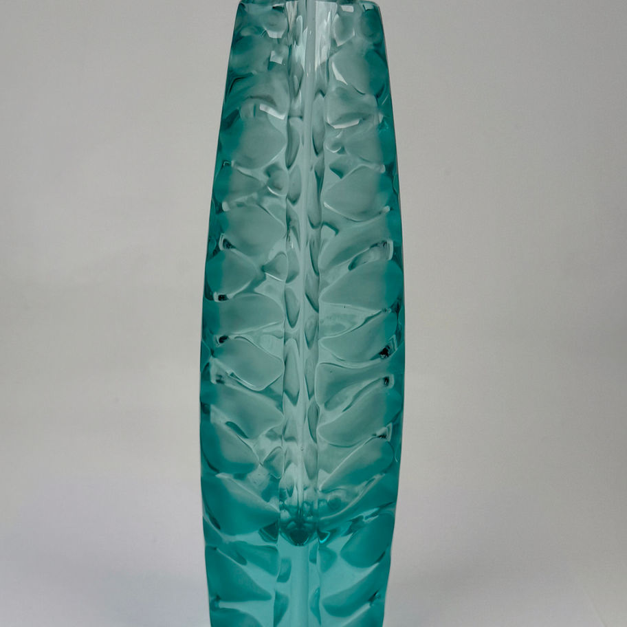 Designová skleněná váza z akvamarínového broušeného, leštěného a matovaného skla dle návrhu Václava Horáčka sklárny ŽBS , výška 19.5cm a šířka 5cm.