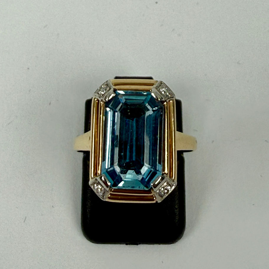 Designový zlatý prsten je osazený 1ks přírodní akavamarín osmihran smaragdového brusu o celkové hmotnosti cca 4.6ct a 4ks přírodní diamant - briliant o celkové hmotnosti cca 0.0015ct Vs,SI,I 18 karátové zlato 4.75g btto, velikost prstenu je 53 po předchozí domluvě na vyžádání lze velikost prstenu upravit, Certifikát přílohou.