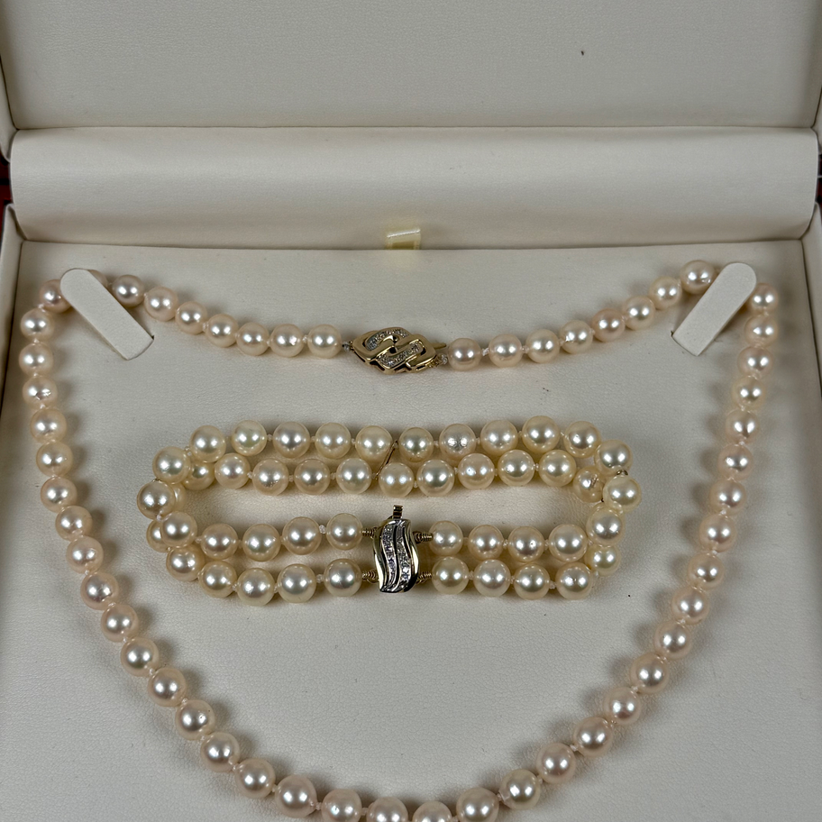 Zlatá perlová souprava s brilanaty - náhrdelník a náramek je osazený přírodními mořskými kultivovanými perlami o průměru 0.7-0.74 cm na nahrdelníku i náramku. Náhrdelník je osazený masivní zlatou sponou s přírodními diamanty a brilianty o celkové váze cca 0.08ct Si,H-I a je nově přeuzlíkován na novou šperkařskou šňůr, celková délka je 46cm Au585/1000 32.25g btto. Perlový náramek má celkovou délku 20cm, šířka je 1.6cm a je táké osazen zlatou masivní sponou osazenou přírodními diamanty - brilianty o celkové váze cca 0.07ct Si, H-I náramek je nově převečený na novou šperkařskou šňůru, Au 585/1000 28.70g btto.