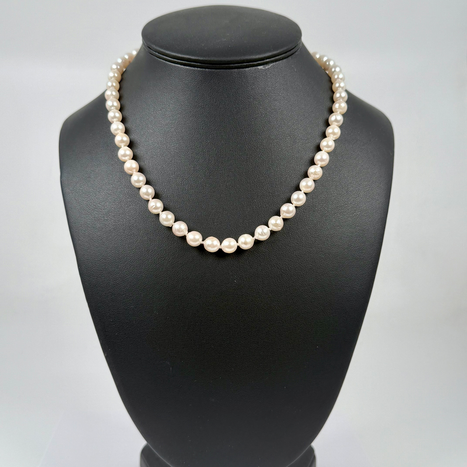 Perlový náhrdelník osazený mořskýma kultivovanýma perlama o průměru 0.7cm je opatřený zlatým balónovým uzávěrem, perly jsou nově přeuzlíkované na novou šperkařskou sňůru, celková délka je 45.5cm Au 585/1000 30.15g btto.