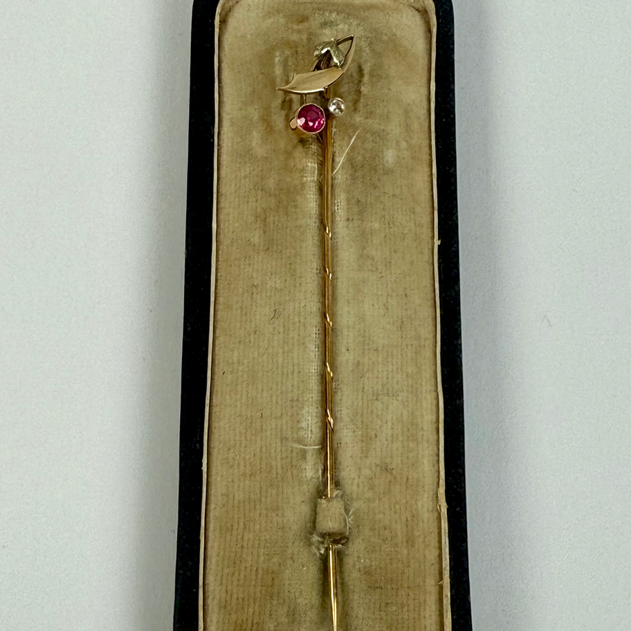 Starožitná zlatá jehlice osazená broušeným syntetickym spinelem a čirým kamenem Au 585/1000 1.30g btto punc čejka Praha délka jehlice je 7cm.