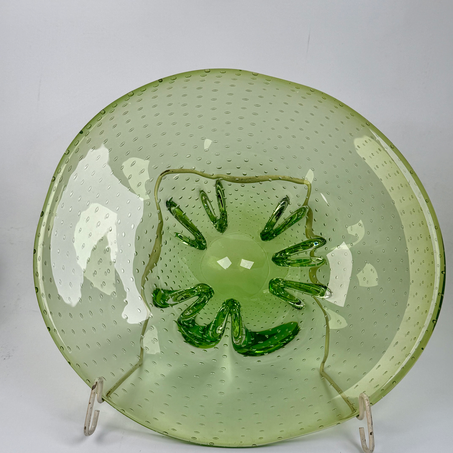Skleněná mísa z hutního skla s bublinkami průměr mísi je 28x26cm a výška je 7.3cm.