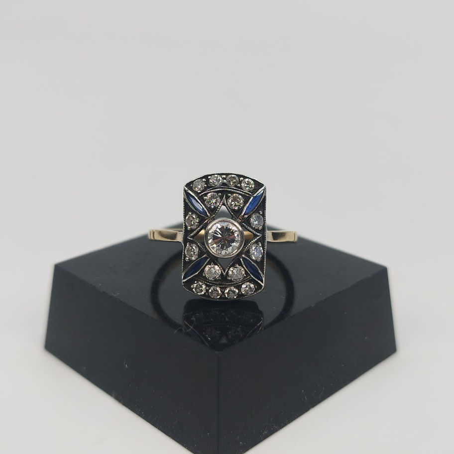 Starožitný luxusní veliký zlatý originál prsten - Art Deco je osazen 17 ks přírodních diamantů - briliantů z toho centrální diamant - briliant má cca 0.35ct celková váha je cca. 1ct. Vs.Si, G-H-I. A 4 ks safírů. Kameny jsou zafasovány v Ag. Velikost prstenu je cca. 60. Certifikát a Osvědcčení Puncovního úřadu Brno je přílohou. Velikost prstenu lze po předchozí domluvě na vyžádání upravit. Au 585/1000 3.40g btto.