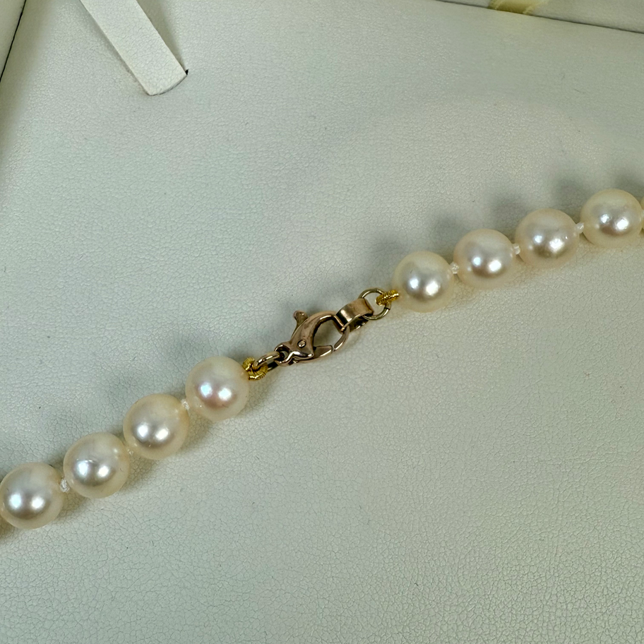 Starožitný perlový náhrdelník - šperkařská šňůra osazená pravými mořskými kultivovanými perlami o průměru 0.85 - 0:86 cm a celkovou délkou 41.5cm, náhrdelník je opatřený masivním zlatým uzávěrem a také nově přeuzlíkován na novou šňůru Au 585/1000 38.50g btto.