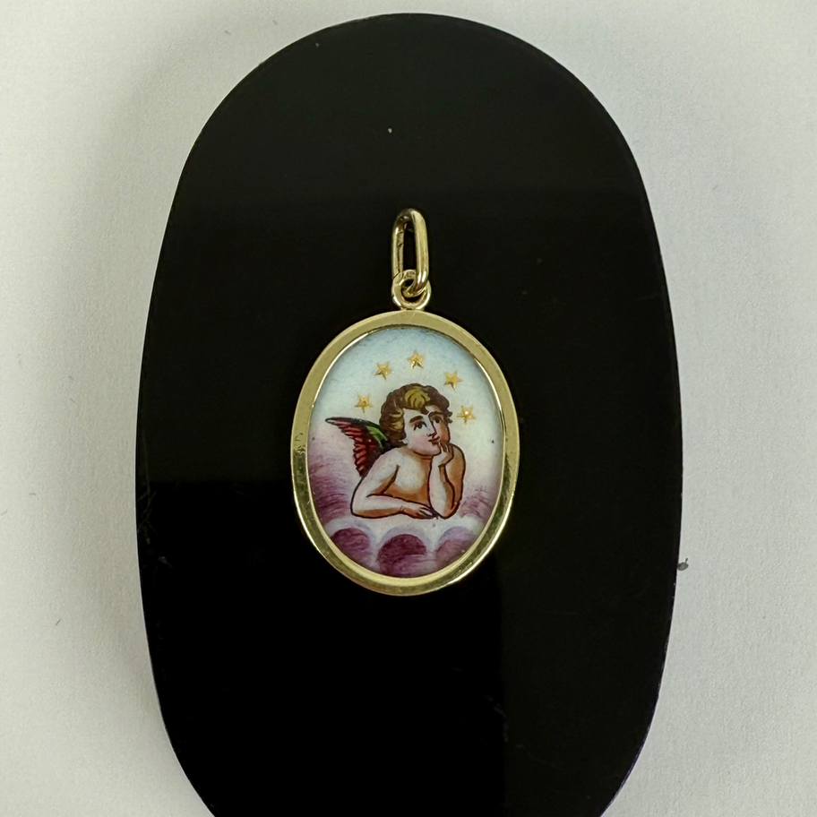 Starožitný zlatý přívěs osazený porcelánovou destičkou s ručně malovaným Andělíčkem dle návrhu Raffael Santiho Au 585/10003.20g btto, výška 2.2cm bez očka a šířka je 1.6cm.