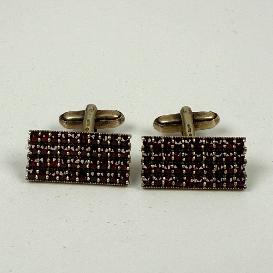 Stříbrné a jemně zlacené manžetové knoflíky jsou osazené přírodními českými granáty Ag 900/1000 11.60g btto, šířka je 2.3cm a výška 2.1cm značeno Turnov.