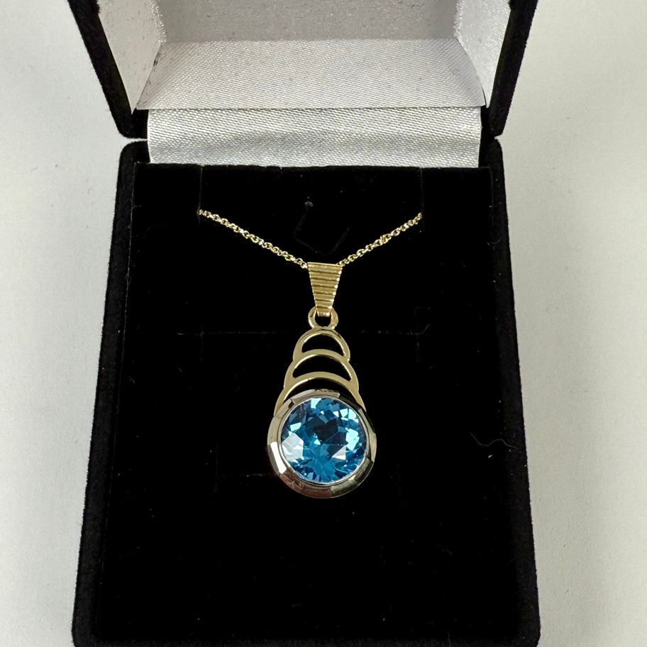 Zlatý náhrdelník řetízek a přívěs. zlatý přívěs osazený syntetickým broušeným spinelem celková výška s ouškem je 3cm a průměr 1.2cm au 585/1000 3.15g btto punc lvíček a zlatý ručně pilovaný řetízek Au 1.70g btto variabilní délka 42.5 - 46cm.